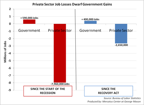 The private sector benefits of Obama’s stimulus have been nil. The growth of government has been phenomenal. Look at the chart below created by Bureau of Labor Statistics, and republished on the National Review Online: